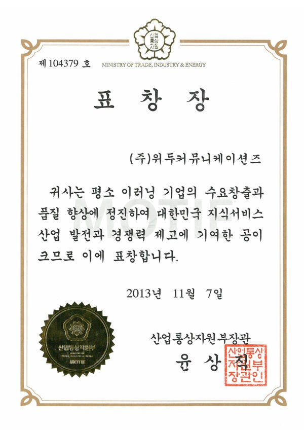 이러닝 기업의 수요 창출과 품질 향상 페이지 정보 작성자 WeDu 댓글 0건 조회 5,643회 작성일 19-05-30 19:32 본문 2013-11-07 표창장 제 104379호 이러닝 기업의 수요 창출과 품질 향상 산업통상자원부장관 윤상직 List Previous한국여성벤처협회 표창장 19.05.30 Next이러닝 콘텐츠 품질 인증 우수 심사 19.05.30