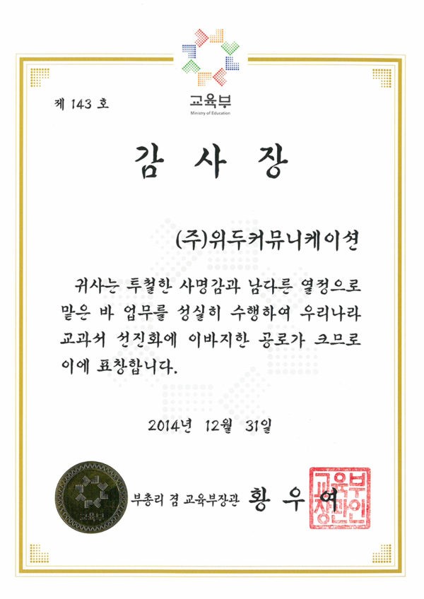 감사장 제 143호 페이지 정보 작성자 WeDu 댓글 0건 조회 5,784회 작성일 19-05-30 19:33 본문 2014-12-31 감사장 제 143호 교과서 선진화 부총리 겸 교육부장관 황우여 List Previous산업통상자원부 표창장 19.05.30 Next한국여성벤처협회 표창장 19.05.30