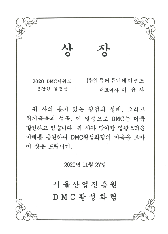 2020 서울산업진흥원 2020 DMC어워드 페이지 정보 작성자 WeDu 댓글 0건 조회 6,221회 작성일 21-12-31 12:57 본문 2020-11-27 2020 DMC어워드 용감한 열정상 서울산업진흥원 DMC활성화팀 List Previous2020 기술혁신 우수기업 21.12.31 Next2018 소년한국 우수 어린이 도서 19.05.30