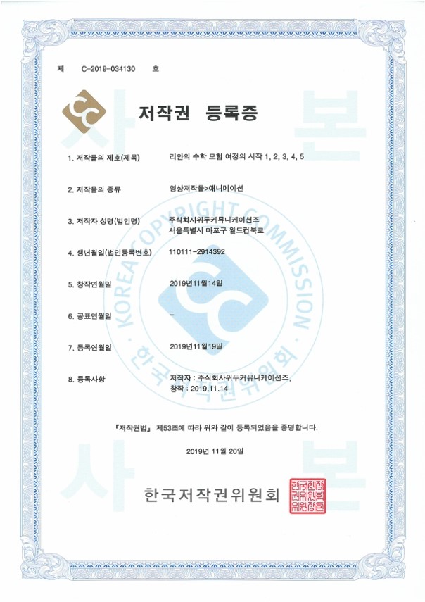 [한국/저작권] 리안의 수학 모험 여정의 시작 1,2,3,4,5 페이지 정보 작성자 WeDu 댓글 0건 조회 5,726회 작성일 21-12-31 12:36 본문 2019-11-20 저작권 C-2019-034130 영상저작물>애니메이션 List Previous[한국/저작권] OLL KIDS/MATH 21.12.31 Next[한국/저작권] 리안의 수학 모험 애니메이션 OST 19.11.25