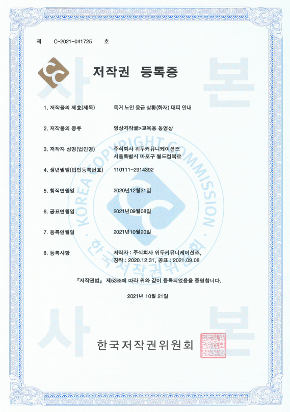 [한국/저작권] 독거 노인 응급 상황(화재) 대피 안내 페이지 정보 작성자 WeDu 댓글 0건 조회 6,185회 작성일 21-12-31 12:41 본문 2021-10-21 저작권 C-2021-041725 영상저작물>교육용 동영상 List Previous[한국/저작권] 장보기 인지훈련 게임 21.12.31 Next[한국/저작권] OLL KIDS/MATH 21.12.31